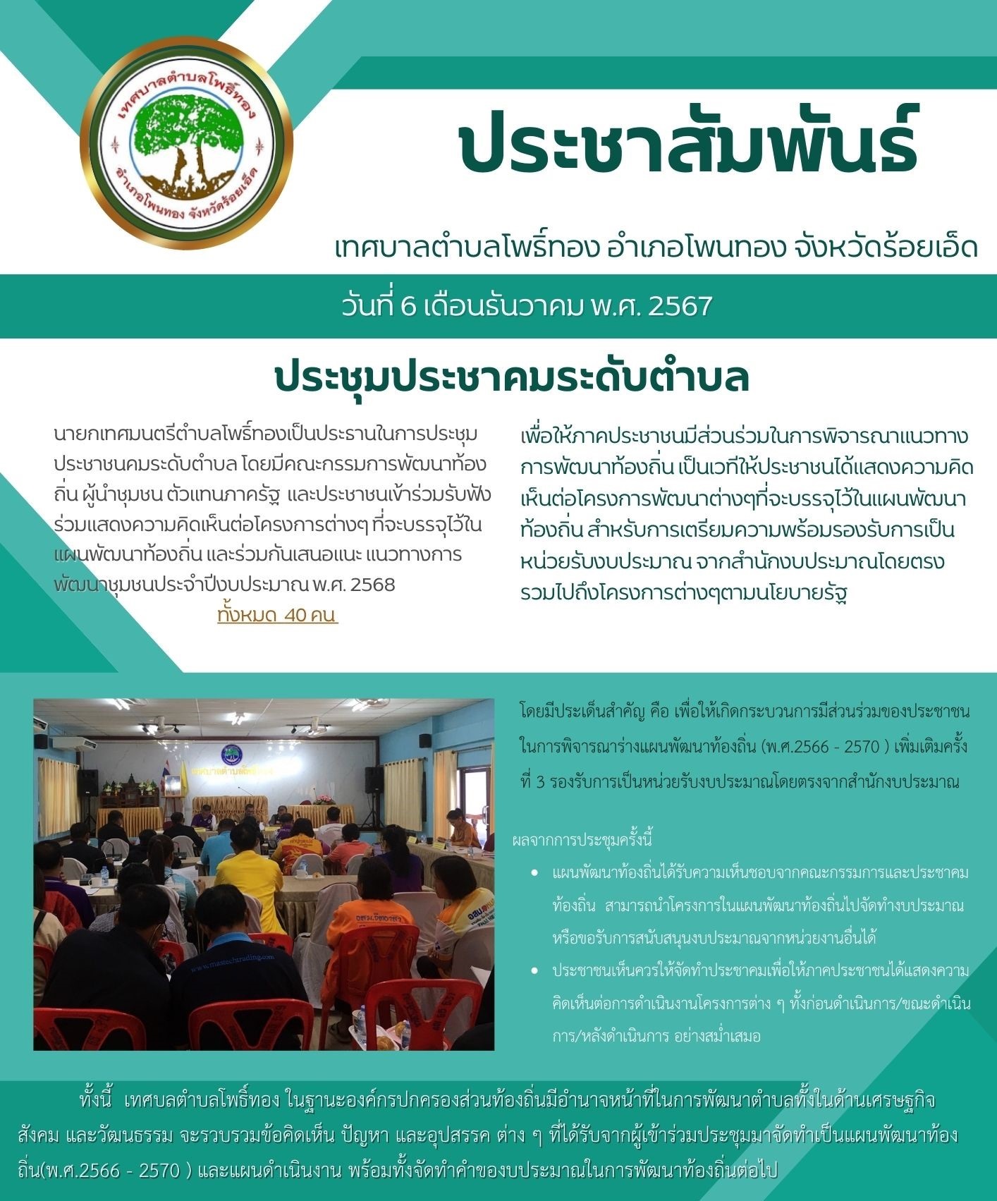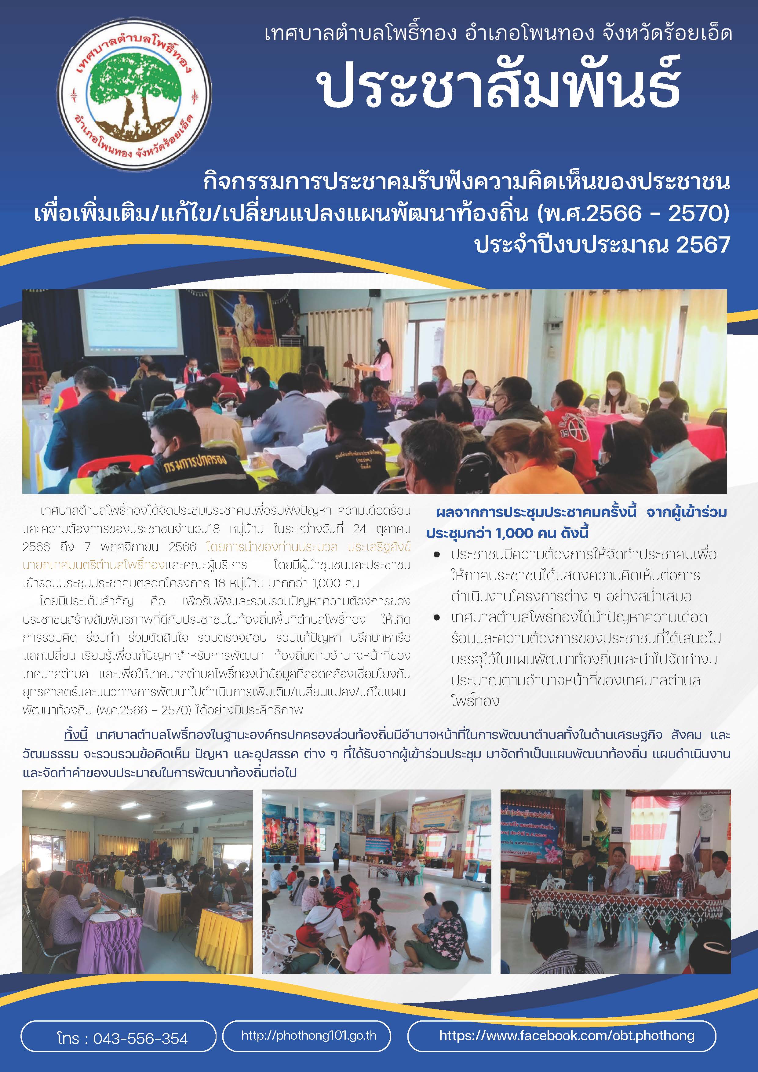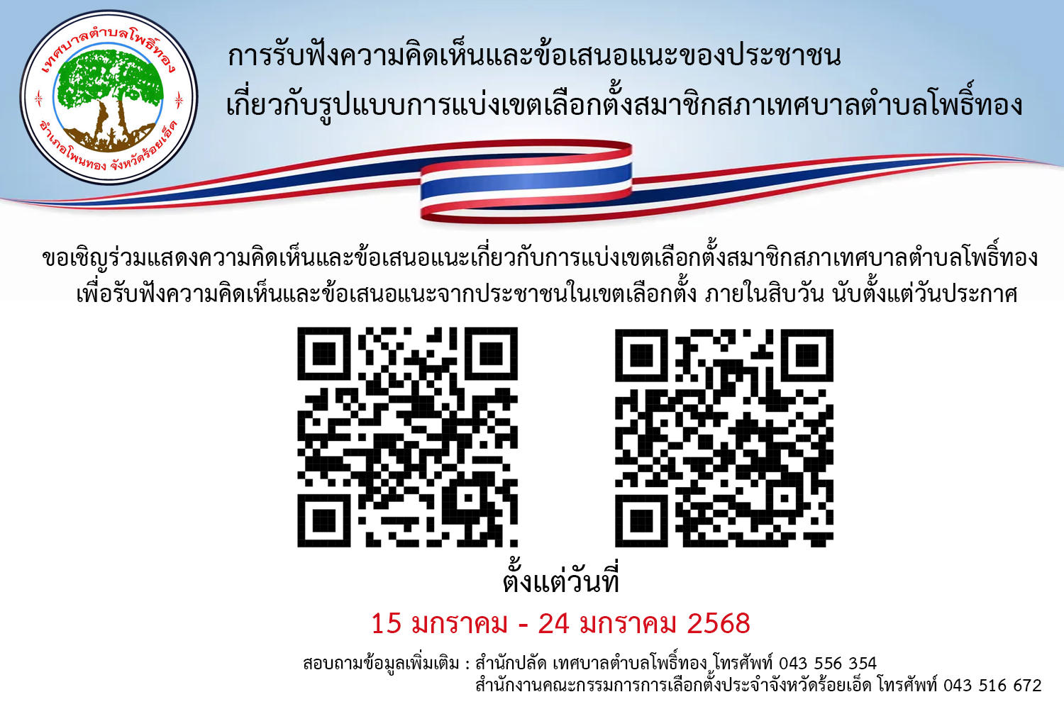 ประชาสัมพันธ์ เชิญชวนให้ประชาชนแสดงความคิดเห็นเกี่ยวกับร่างประกาศแบ่งเขตเลือกตั้งสมาชิกสภาเทศบาลตำบลโพธิ์ทอง อำเภอโพนทอง จังหวัดร้อยเอ็ด