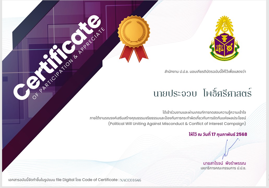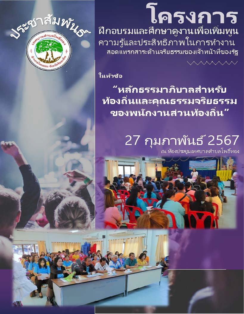 เมื่อวันที่ 17 กุมภาพันธ์ 2568 เวลา 08.30 น. เป็นต้นไป นายประมวล ประเสริฐสังข์ ตำแหน่งนายกเทศมนตรีตำบลโพธิ์ทอง ได้ส่งเสริมสนับสนุนให้ ข้าราชการ พนักงานจ้าง และผู้ที่สนใจเข้าร่วมรับชมถ่ายทอดสด “งานรณรงค์เสริมสร้างคุณธรรมจริยธรรมและป้องกันการกระทำผิดเกี่ยวกับการขัดกันแห่งผลประโยชน์”