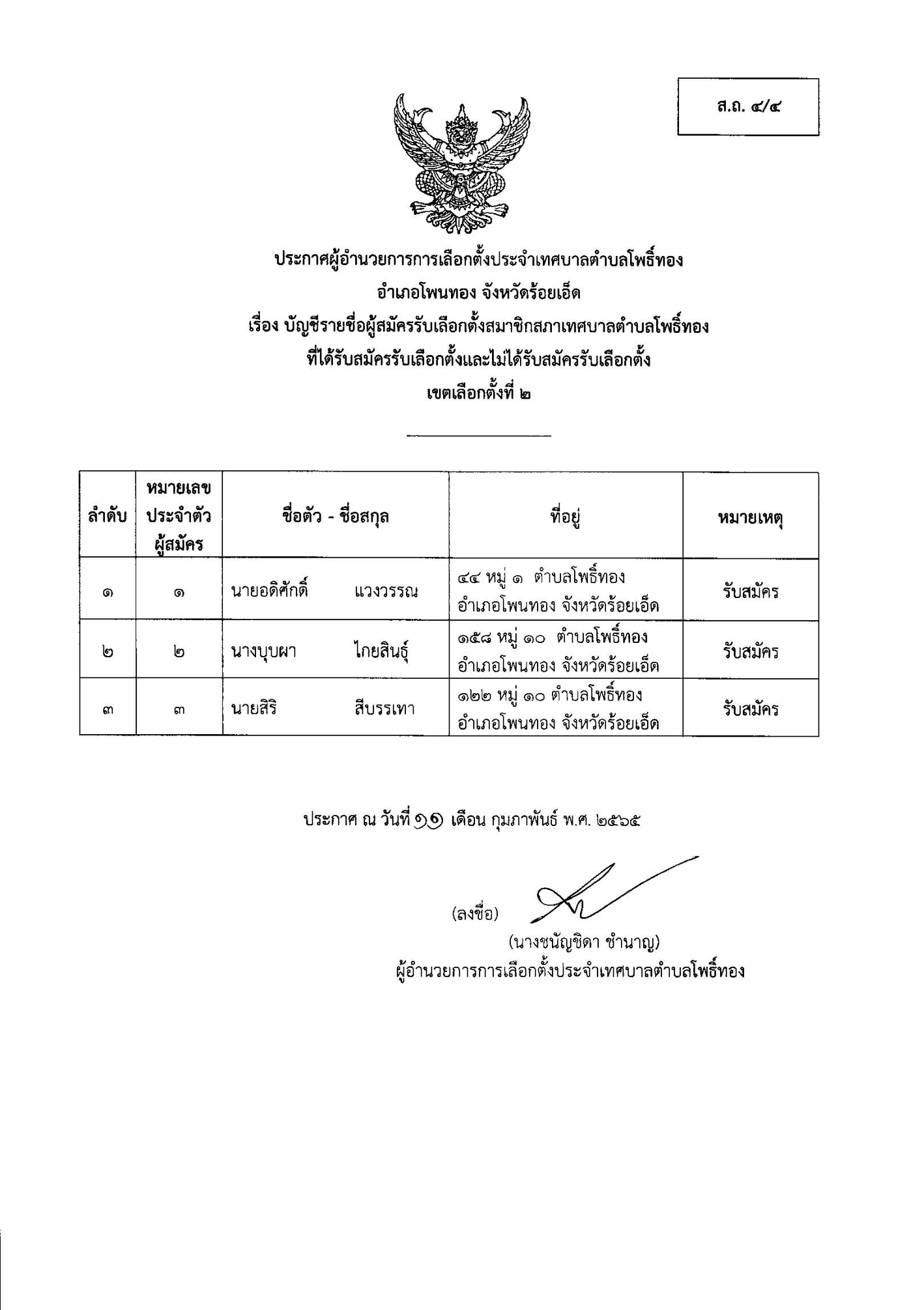 ประกาศบัญชีรายชื่อผู้สมัครรับเลือกตั้งสมาชิกสภาเทศบาลตำบลโพธิ์ทอง เขตเลือกตั้งที่ 2