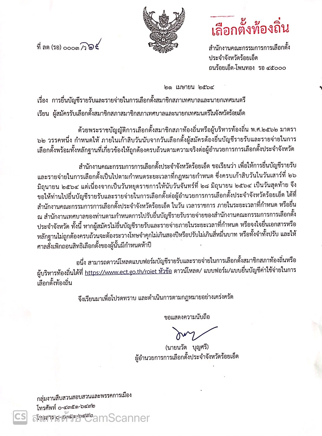 ประชาสัมพันธ์เพิ่มช่องทางวิธีการยื่นบัญชีรายรับและรายจ่ายในการเลือกตั้งสมาชิกสภาท้องถิ่นหรือผู้บริหารท้องถิ่น โดยผู้สมัครรับเลือกตั้งเป็นสมาชิกสภาท้องถิ่นหรือผู้บริหารท้องถิ่น สามารถยื่นบัญชีรายรับและรายจ่ายในการเลือกตั้ง พร้อมทั้งหลักฐานที่เกี่ยวข้องให้ถูกต้องครบถ้วนตามความเป็นจริงต่อผู้อำนวยการการเลือกตั้งประจำจังหวัดด้วยวิธีการยื่นทางไปรษณีย์ลงทะเบียนหรือยื่นทางไปรษณีย์อิเล็กทรอนิกส์ (E-mail) ของสำนักงานกกต.ประจำจังหวัดก็ได้ โดยให้ถือวันประทับตราของบริษัท ไปรษณีย์ไทย จำกัด หรือวันส่งไปรษณีย์อิเล็กทรอนิกส์ (E-mail) แล้วแต่กรณี เป็นวันที่ผู้สมัครรับเลือกตั้งได้ยื่นต่อผู้อำนวยการการเลือกตั้งประจำจังหวัด